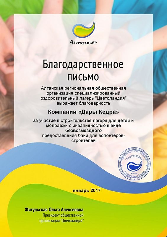 Благодарим компанию «Дары Кедра» за шикарный подарок - кедровую баню-бочку для строителей-волонтеров лагеря для детей с инвалидностью «Цветоландия». В конце 2016 года мы обратились к руководству компании и они пошли нам навстречу, за что от волонтеров, детей, родителей команды лагеря - ОГРОМНОЕ СПАСИБО! Компании, которые думают об окружающих их людях, помогают им - достойны уважения. Дары Кедра + Цветоландия = друзья forever!