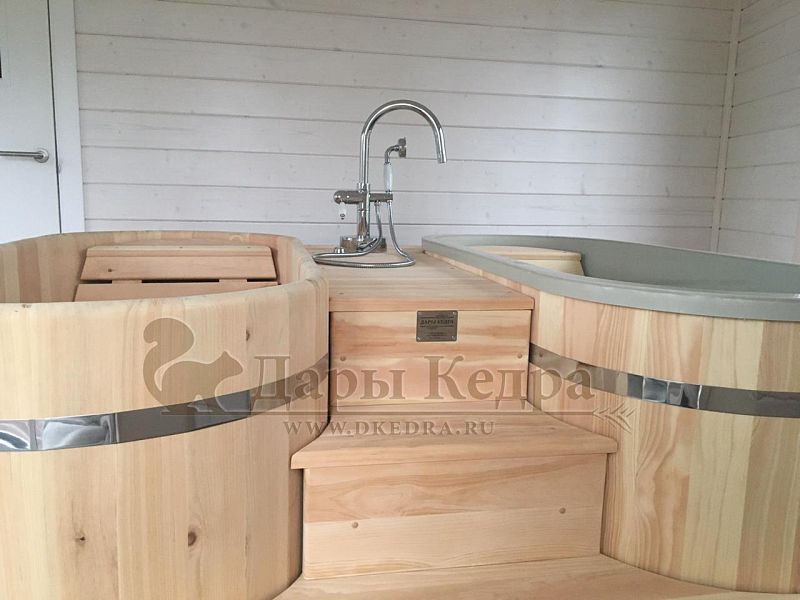 Заказывали себе домой две ванны с подиумом: одна ванна с пластиковой вставкой для более частого использования, вторая ванна-просто из кедра, так захотел муж, чтобы разные ванны были. После бани окунуться в прохладную водичку в ванной - это чудо! И с ними, кстати, намного уютнее стало.