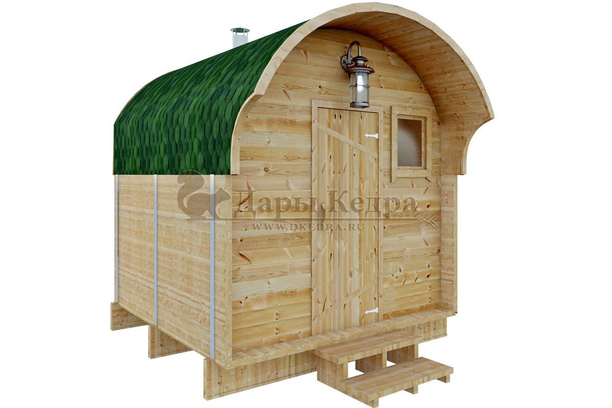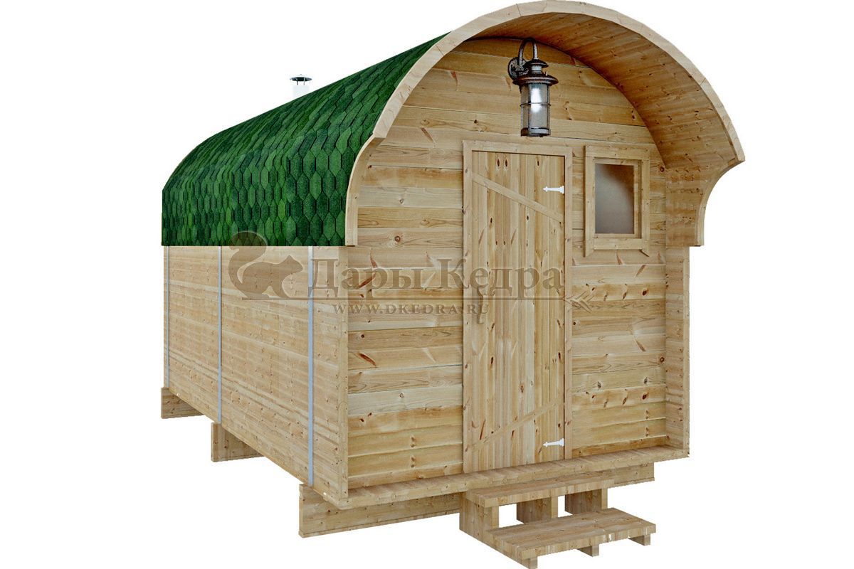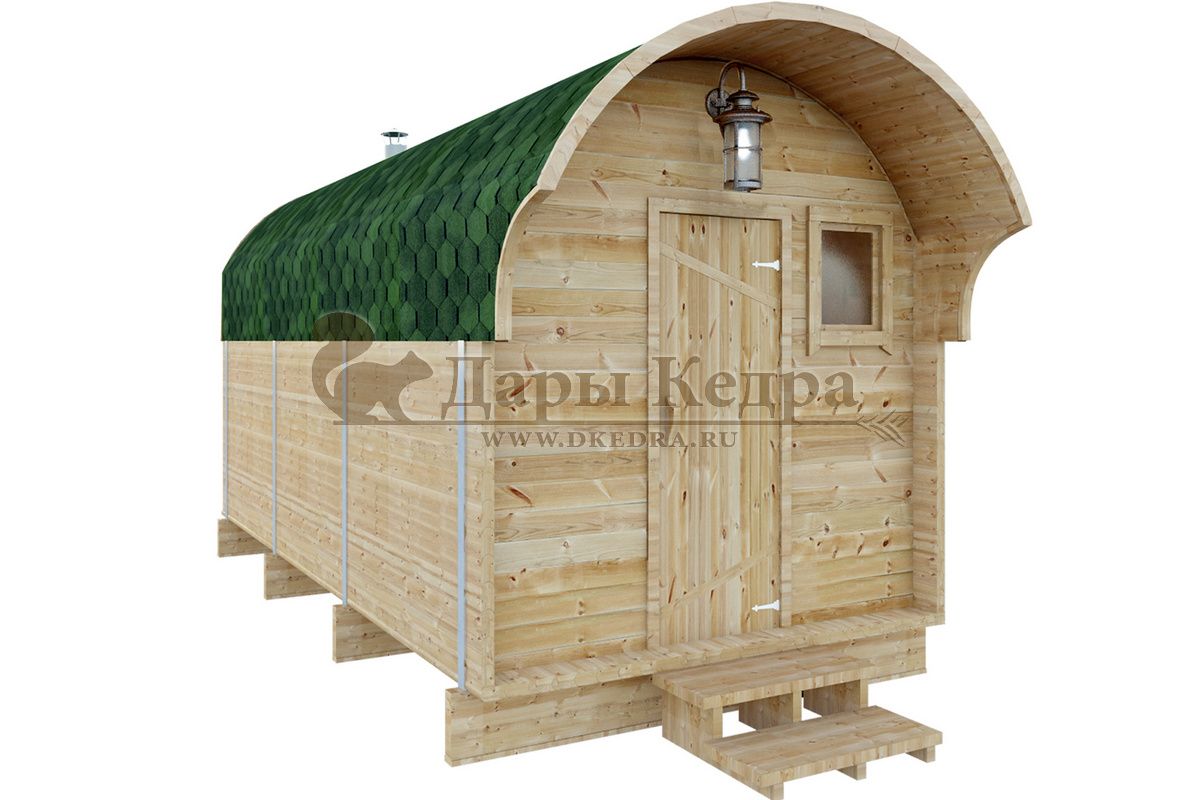 Баня-бочка буханка из кедра 3,5 метра Это более просторная модель за счет увеличенной высоты потолков и ровного пола. В такой модели раздевалка совмещена с моечной. Тут установлен душевой поддон, вешалка, полочка и лавочка из кедра. В парильном отделении по обе стороны расположены двухуровневые открытые полки, печь находится между ними у дальней стены. Время растопки такой бани не превышает 30 минут. По вашему желанию баню-бочку можно укомплектовать козырьком, верандой и печью с внешней загрузкой, благодаря которой весь мусор во время топки остается на улице. Баня-бочка буханка не требует полноценный фундамент, поэтому при необходимости ее можно перенести в другое место. Обращаем Ваше внимание, что в стандартную комплектацию бани входят полки открытого типа в парной с обеих сторон. Дополнительно можно заказать полок закрытого типа или лавку! Кедр обладает ароматическими свойствами. Он не деформируется и влагоустойчив, при правильном уходе за деревом на нем не развиваются грибки и плесень.