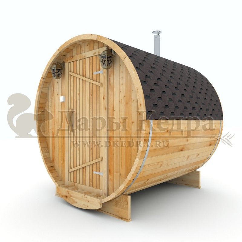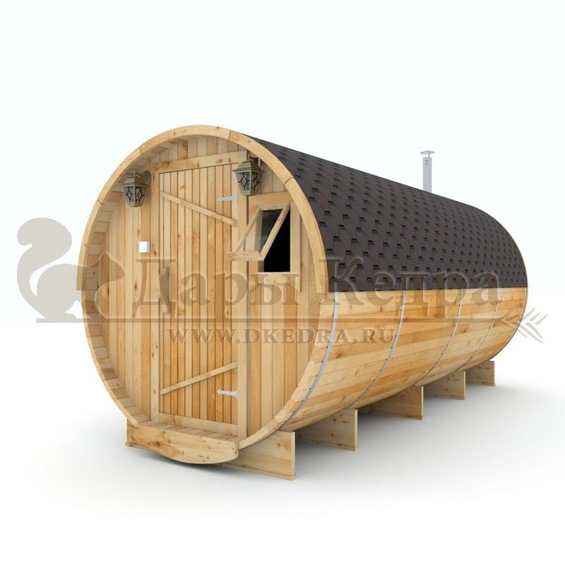 Баня-бочка буханка из кедра 3,5 метра Это более просторная модель за счет увеличенной высоты потолков и ровного пола. В такой модели раздевалка совмещена с моечной. Тут установлен душевой поддон, вешалка, полочка и лавочка из кедра. В парильном отделении по обе стороны расположены двухуровневые открытые полки, печь находится между ними у дальней стены. Время растопки такой бани не превышает 30 минут. По вашему желанию баню-бочку можно укомплектовать козырьком, верандой и печью с внешней загрузкой, благодаря которой весь мусор во время топки остается на улице. Баня-бочка буханка не требует полноценный фундамент, поэтому при необходимости ее можно перенести в другое место. Обращаем Ваше внимание, что в стандартную комплектацию бани входят полки открытого типа в парной с обеих сторон. Дополнительно можно заказать полок закрытого типа или лавку! Кедр обладает ароматическими свойствами. Он не деформируется и влагоустойчив, при правильном уходе за деревом на нем не развиваются грибки и плесень.