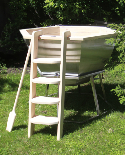 • Банный чан из нержавеющей стали Ø-2350 на подставке с приставной печью Банный чан с приставной печкой изготовлен из пищевой стали. Представляет собой большую ёмкость в виде чаши, при нагревании которой можно париться на свежем воздухе. Чан установлен на устойчивую металлическую подставку и оснащен приставной печью с дымоходом. Банный чан оборудован кедровым бортом, скамейками, подспинниками, трапом для ног и приставной лестницей.