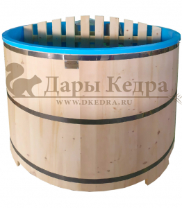 Это уличная подогреваемая купель с круглой внутренней чашей из термопластика. Для удобства пользования купель оборудована лавочками, приставной и внутренней лестницей. Нагрев воды происходит за счет встроенной печи, которая находится внутри купели за перегородкой. В комплектацию этой модели входит савок с длинной ручкой, который позволяет извлекать угли после эксплуатации изделия. Термопластик устойчив к воздействию температур, облегчает уход за купелью и увеличивает срок ее службы.