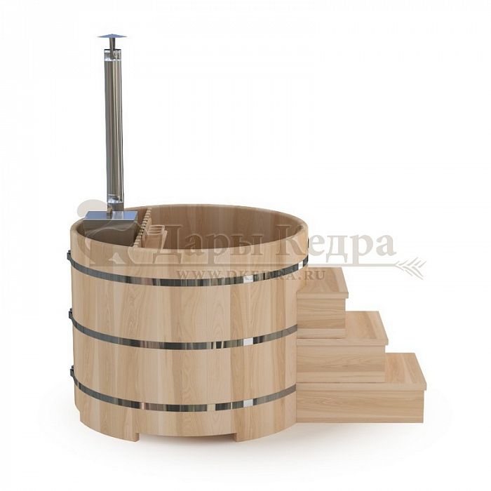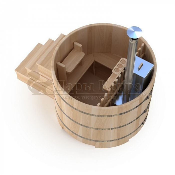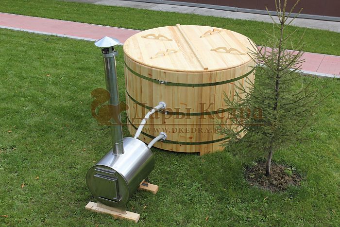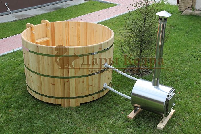 Существует два способа нагрева воды: с помощью встроенной или внешней печи. Традиционно применялась бочка с дровяной встроенной печкой. Такую баню рекомендуется установить на улице или в помещении с правильной организацией дымохода. Чтобы уберечь человека от ожогов, печь оборудована специальной деревянной перегородкой. Внутренняя печь быстрее нагреет воду, но при этом сократит пространство внутри купели. Это необходимо учитывать, когда делаете выбор между быстротой прогрева, и вместимостью купели.